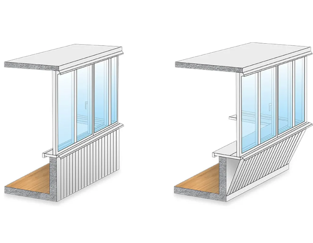 Остекление лоджий с выносом пластиковых окон может предполагать демонтаж очень ветхого парапета. Если пристройка находится на последнем этаже, обязательно устанавливают крышу и козырек. Это необходимо для дополнительной защиты от осадков. Остекление лоджий с выносом подоконника или пола включает также декоративную отделку для эстетичности и ветрозащиты.