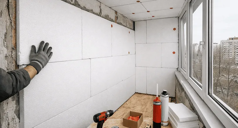 При утеплении балкона листы пенопласта монтируются на все поверхности с обязательной герметизацией швов, что исключает появление мостиков холода. Лёгкий вес материала не перегружает конструкцию, что особенно важно при утеплении балкона в новостройке или старом доме.