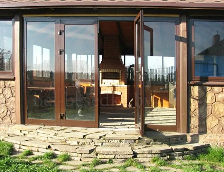 Распашное остекление предполагает установку оконных створок, которые открываются наружу или внутрь по принципу обычных распашных дверей. Этот вариант идеально подходит для беседок, так как обеспечивает удобный доступ к свежему воздуху, простую вентиляцию и эстетичный внешний вид.