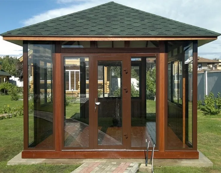 Холодное остекление беседки, веранды, оранжереи или зимнего сада позволит поддерживать комфортные условия внутри конструкции при любой погоде. Несмотря на то, что профили не имеют теплоизолирующей вставки, они способны обеспечить температуру, на 100С выше, чем температура зимой на улице. При остеклении мы используем профили двух типов.