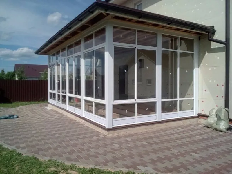 Наша компания производит и устанавливает окна из профиля бренда REHAU. Кроме пластика, можно также использовать теплое алюминиевое остекление или холодное — для веранд, беседок и других неотапливаемых помещений.